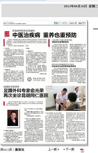 昆明同仁医院(以下简称同仁医院)中美骨科中心于2013年6月正式建立“国内顶级专家联合巡诊”平台。自巡诊平台建立以来,同仁医院陆续邀请到了我国著名的足踝外科专家王正义教授及俞光荣教授到昆坐诊。俞光荣在7月份的首次坐诊,便得到了昆明市民的广泛好评。坐诊期间,俞光荣认真接待每位前来看病的患者,并对患者的病情提出了针对性的治疗方案。